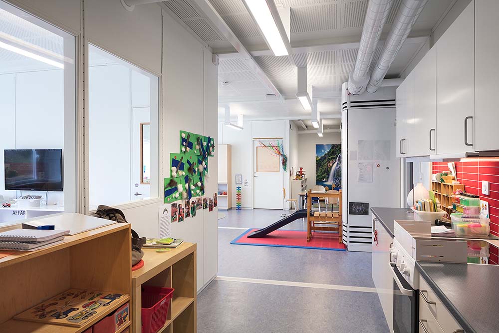 Högalids förskola är byggd i ett plan med egna entréer för varje avdelning och ett mottagningskök.