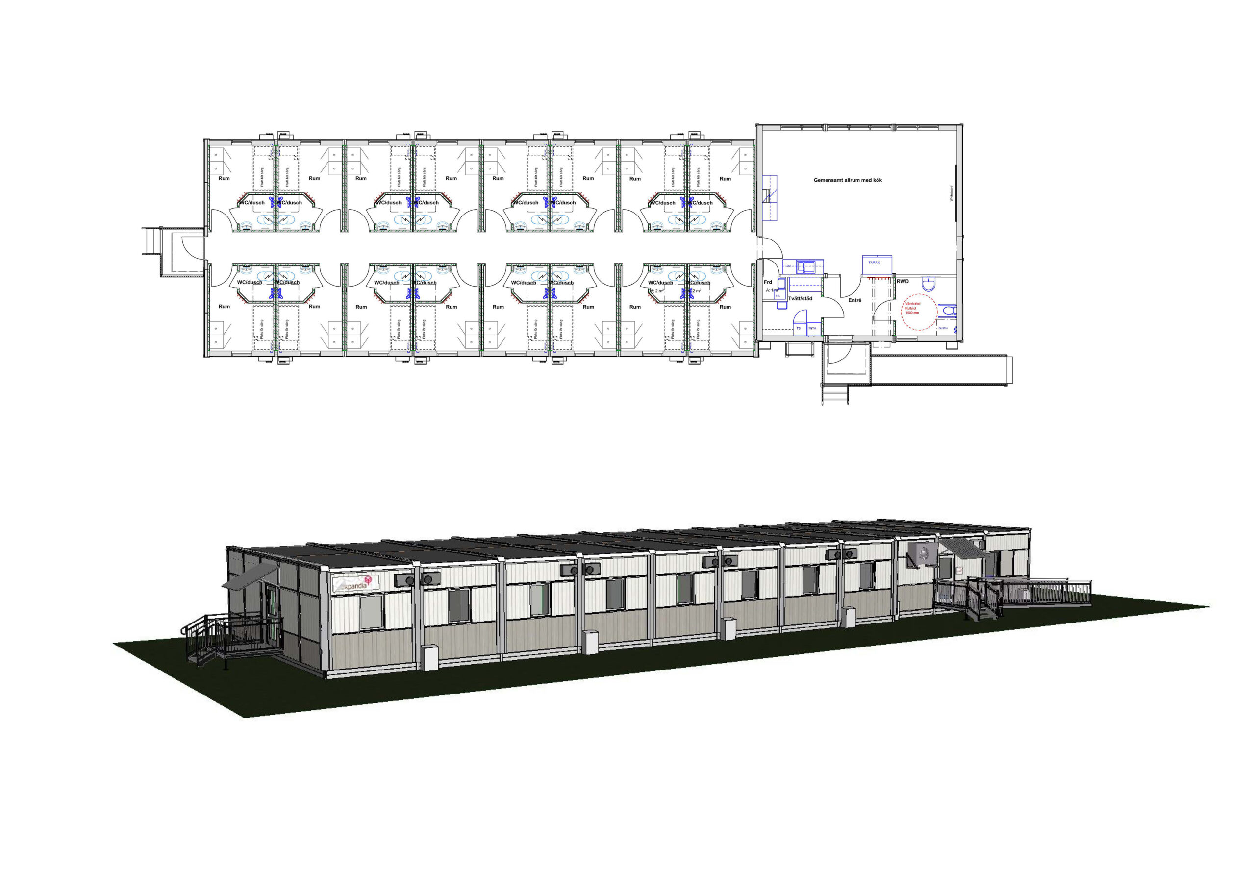 I modulbyggnaden finns också en gemensam lokal med kök, soffor och tv samt en handikapptoa och en tvättstuga.